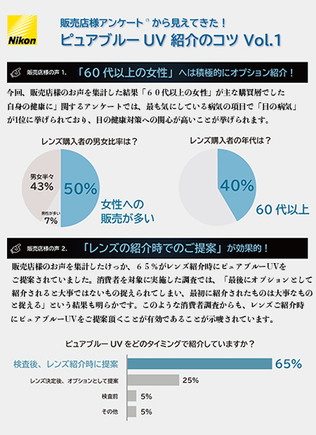 目と耳の豆知識 2021.9 ピュアブルーUV紹介のコツ ブルーライトカット+UV420の提案 レンズ購入者の男女比率:女性が多い レンズ購入者の年齢は:60代以上 ピュアブルーUVのご紹介タイミング:レンズのご紹介時に最初にご提案 ※画面の印刷は画面の何もない所でマウス右クリックして印刷を選択 ※前回 2021.7 もしかして補聴期の回